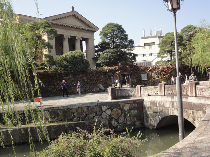 暫く南下すると倉敷観光案内所が現れる。(写真7) その対岸に美観地区でも美しい場所がある。(写真8) よく眺めると石橋の左側で2台の人力車が待機している。最近は修学旅行らしい中学生の団体や、海外からの観光客が増えてきて、昔とは異なる風情が感じられる。更に南下して左折してアイビースクエアを訪れ、昔の倉敷紡績工場の栄華を偲んだ。ここから北上して、再び有隣荘の北にある倉敷物語館を訪れて、倉敷の歴史を探訪してから休息した。(写真9)