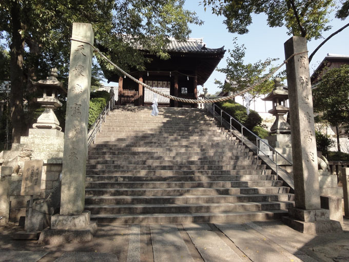 一昨年、墓参の翌日に倉敷市の地図を広げて眺め、有名な阿智神社を訪れていないことを発見した。阿智神社の石段の数は多いので、家内と相談して登りは石段を諦め、倉敷駅前から倉敷中央通りを南下して左折し鶴形公園を経由して、ゆっくり周りの景色を見物しながら裏道から登ることにした。(写真1)は阿智神社の随神門の下にある33段の厄除け石段である。この下には61段の還暦段、88段の米寿段がある。随神門の内側には7段、拝殿に5段、荒神社に3段の石段がある。神社の周囲には様々な建物があるが、(写真2)は絵馬殿と高灯篭である。ここからは昔に比べ様変わりした倉敷市街が一望できた。(写真3)下りは石段に挑戦したが、数回休憩しながら無事に降りた。