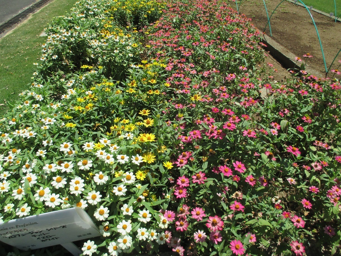 ●ひゃくにちそう(百日草):メキシコ高原原産。初夏から晩秋まで長い間咲くのでこの名前になった。色は(白、赤、黄、ピンク)など多種ある。この写真の花の色は(イエロー、ホワイト、チェリー)です。