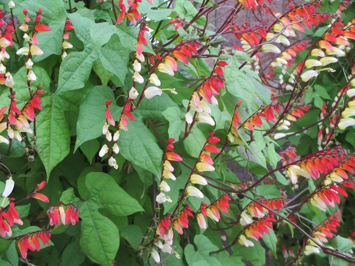 ●ミナロバータ(ジャングルクイーン):原産地はメキシコ。花色が蕾の赤からオレンジ→黄→白とします。英名=「Spanish flag」:(赤・黄・赤)に並んだ横三色のスペインの国旗と同じ花色なのでこう呼ばれるようです。また、メキシコは長くスペインの植民地であったからでしょう。