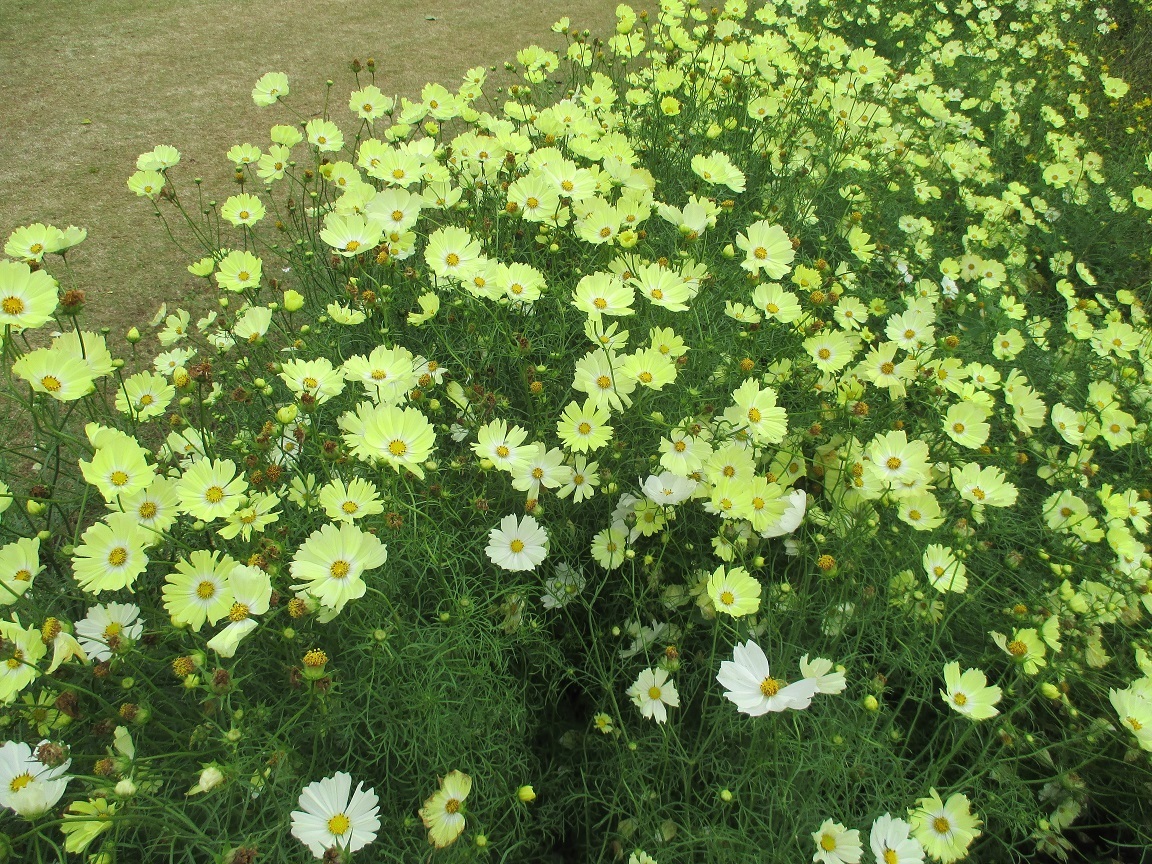 ●コスモス(キャンパスイエロー):原産地はメキシコ。キバナコスモスとは別種です。和名は開発者の玉川大学によって「学園を彩るコスモス」の意を込めて「イエロー・キャンパス」と命名されたそうです。