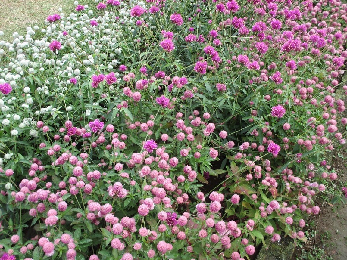 ●千日紅(ホワイト・ピンク・パープル):原産地は熱帯アフリカ、熱帯アメリカ。花言葉=「色あせぬ愛・不朽」。この花は花期が長いだけでなく、乾燥に強く、ドライフラワーにしても美しい花色を保ちます。花言葉の「色あせぬ愛」はその特性に由来するものと思われます。