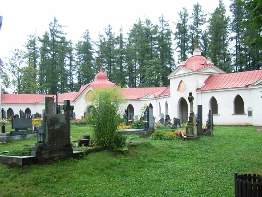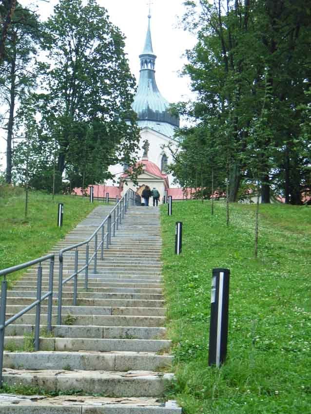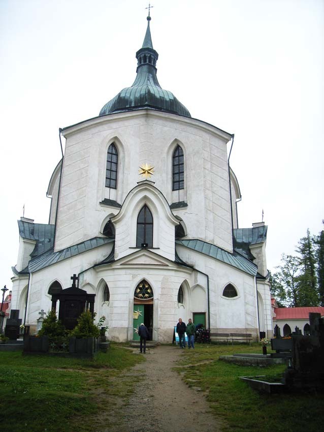 8月16日朝、ブルノ駅から列車で北西に向かい約1時間半でズジャール・ナト・サーザヴォ駅に到着した。市バスでゼレナー・ホラで降りると、長い壁の中心に入口があった。ここから歩いて更に長い石段を登って聖堂を訪れた。(写真8)五角形の聖ネポムツキー聖堂(写真9)は、5つの小礼拝堂(写真10)に囲まれている。囲まれた内部は、聖堂の周囲が墓地になっている。航空写真を見れば、全貌が良く判ると思う。礼拝と見学をして、再び長い石段の上からゼレナー・ホラの村を眺めると、不思議に静寂な景色が広がり、別世界に来たような気がした。再び市バスのお世話になり、ズジャール・ナト・サージャヴォ駅から列車でブルノ駅に17時に到着した。