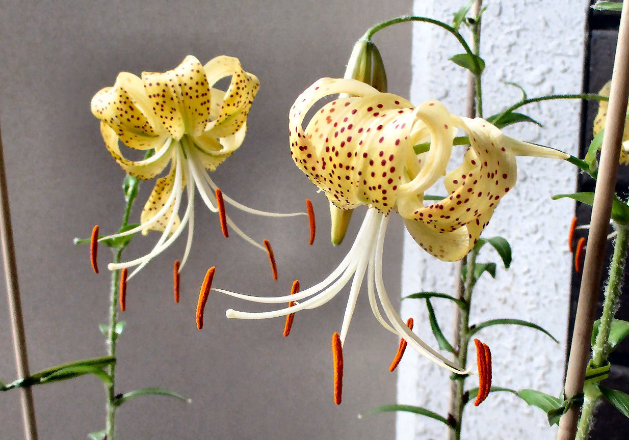 ●オーゴンオニユリ(黄金鬼百合):原産地は日本(長崎県対馬特産)。黄色に赤い斑点、下向きに咲く花。