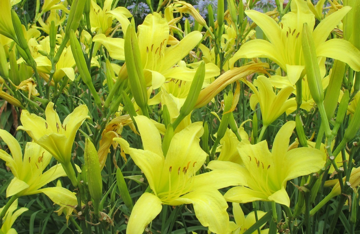 ●ヘメロカリス:ユリ科の花で別名を「デイリリー」という。原産地はアジア東部、花が短命で一日でしおれてしまうので、「デイリリー」と呼ばれるが、次々と花を咲かせるので常に沢山咲いているようにみえる。ユウスゲやカンゾウ(ノカンゾウ、ヤブカンゾウなど)を元にして品種改良で生まれたものを「ヘメロカリス」と呼ぶ。