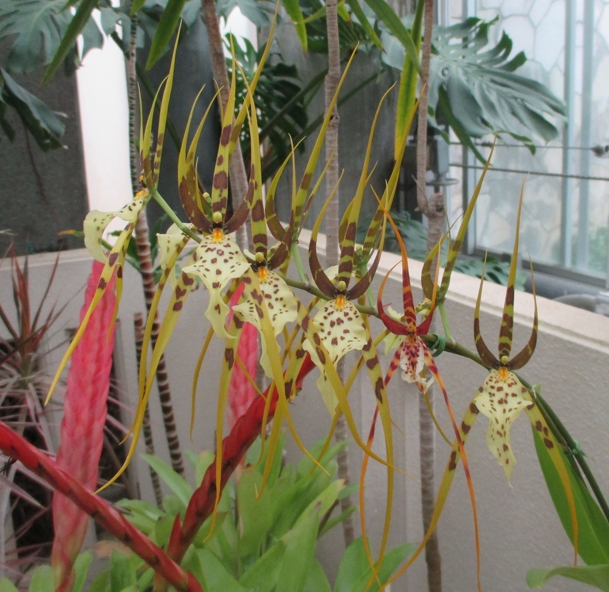 ●ブラッシア:(ラン科、ブラッシア属)この花だけは、大船植物園フラワーセンターの温室内で撮影しました。黄色のベースに茶色の模様が入る花です。英語ではスパイダーオーキッド(蜘蛛蘭)と呼ばれている。原産地は、メキシコ~南米北部。