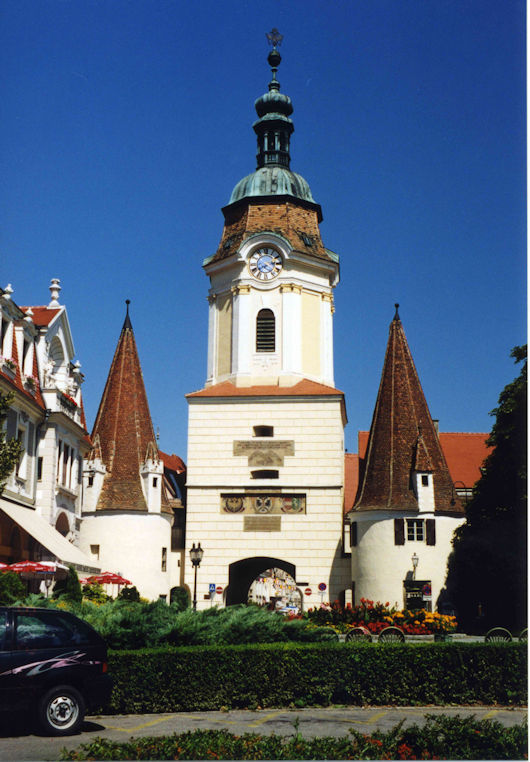 8月2日早朝にウィーン中央駅を列車で出発して西方に向かい、1時間20分でクレムス駅に到着した。駅の正面から北へ直進して左折すると、メイン通りになる。市庁舎や賑やかな市街(写真5)を通り抜けると、町のシンボルであるシュタイナー門(写真6)に到着する。