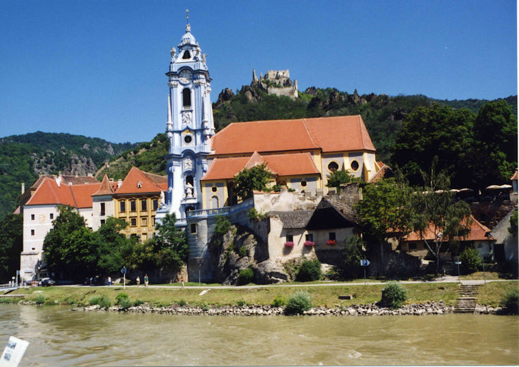 午後1時に波止場から定期遊覧船に乗りドナウ川を遡り、約30分でデュルンシュタインに到着して下船した。途中の風景は素晴らしかった。(写真7)はクレムス波止場を出発して間もなく撮影し、(写真8)はデュルンシュタイン波止場の近くで撮影した。デュルンシュタイン波止場に近いホテルにリュックを置いて身軽になり、小さな町を散策した。大きなグループツアーの客が結構大勢いて、昔の城壁跡の前でガイドさんの説明を熱心に聞いていた。