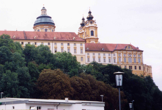 メルクの船着場から壮大なメルク修道院の全貌が現れたが、すべてを撮影するのは難しい。(写真4)町に入ると修道院前部の尖塔しか見えない。早速ホテルにリュックを預けて、メルク修道院を訪れた。ここから見下ろすとメルクの美しい市街が一望できる。(写真5)(写真6)小さな町なので、半日あれば古風な街並みを堪能するには充分であった。(写真6)に見える教会も、地上からは街並みとうまく調和していた。夕方ホテルのテラスで夕食を宿泊客達と楽しんでいたら、急に雨が降り出し慌てて全員ホテルの食堂に移動した。
