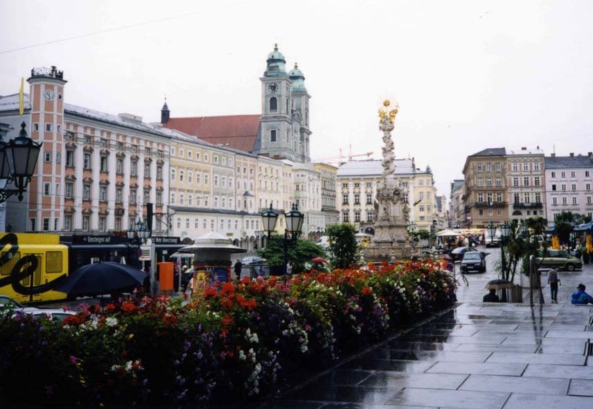 8月4日朝7時50分に列車に乗り、9時にリンツに到着したが、幸い雨は降っていなかった。リンツ駅は市街の南部にあるが、市電があるので観光には便利である。ホテルにリュックを預けて、市街北部にあるハウプト広場を訪れた。ここはドナウ川の南岸に接している。広場の中心には、三位一体の柱がある。(写真7)写真左側に旧大聖堂が見える。新大聖堂は、駅から広場に来る途中にあるが、ウイーンのシュテファン寺院に次いで、オーストリア第二の高さを誇る尖塔がある。大き過ぎて写真は空ばかりになってしまう。ハウプト広場の周囲には、市庁舎、州庁舎、教会、州立劇場など見応えのある建物が多くある。