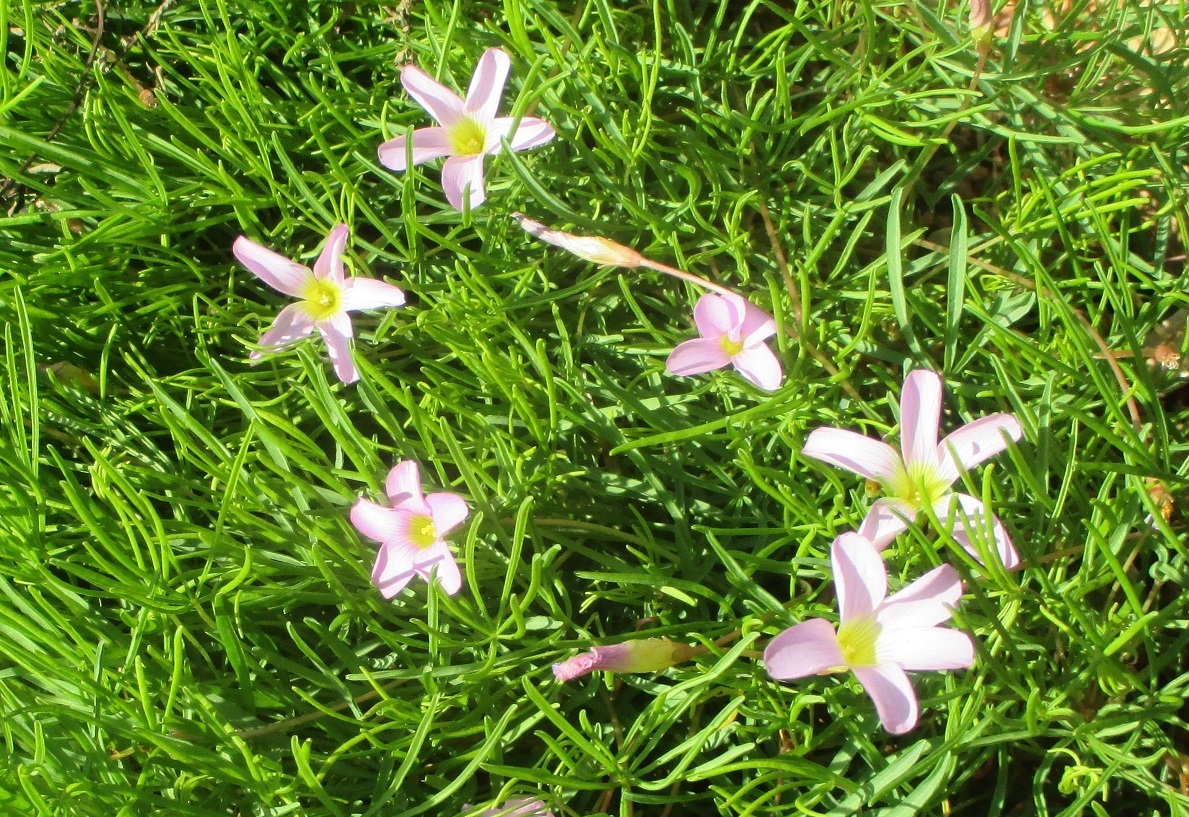 ●オキザリス・ペンタフィラ:別名(ゴヨウカタバミ・マツバカタバミ)。原産地=南アフリカ(ケープ地方)。5枚葉という意味の pentaphylla(ペンタゴンの親戚語)、細めの5弁のピンクの花が優しく開いています。