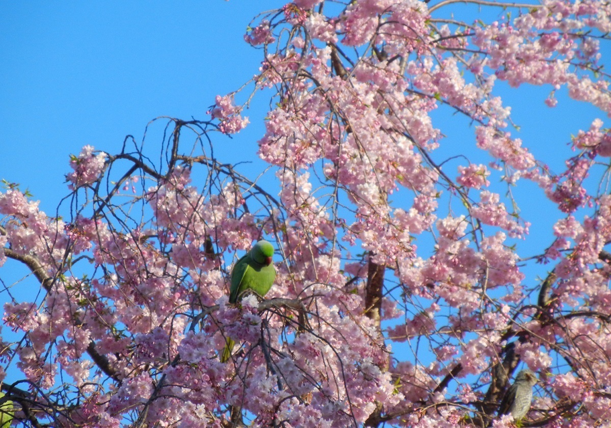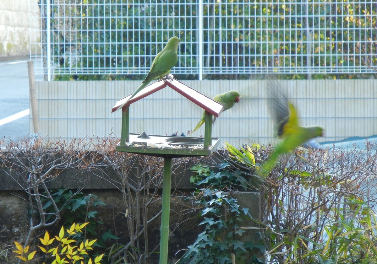 代々木公園、明治神宮などに近いせいでしょうか、街の中の狭い我が家の庭にも野鳥はやってきます。秋11月、木の実の少ない時節になると家内が庭の餌台にパン屑などを置いています。ここにスズメ、ムクドリ、四十雀など。時にはアカハラがやってきて餌を食べています。このところ青色の羽のきれいなオナガのギャーっという声が聞こえなくなりました。都市開発によってねぐらを追われたのでしょうか。その代わりにインコが来るようになりました。インコは飼鳥ですから野鳥ではありませんが、多分鳥かごから逃げ出したものが野生化したのでしょう。