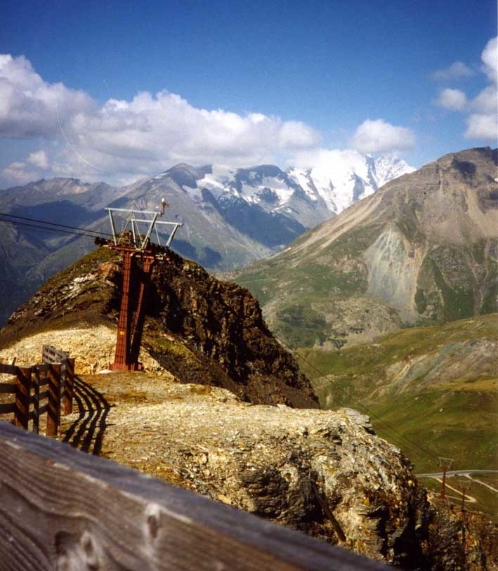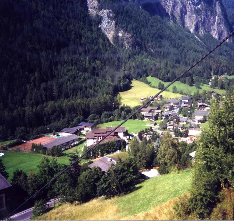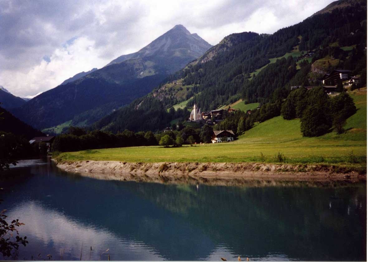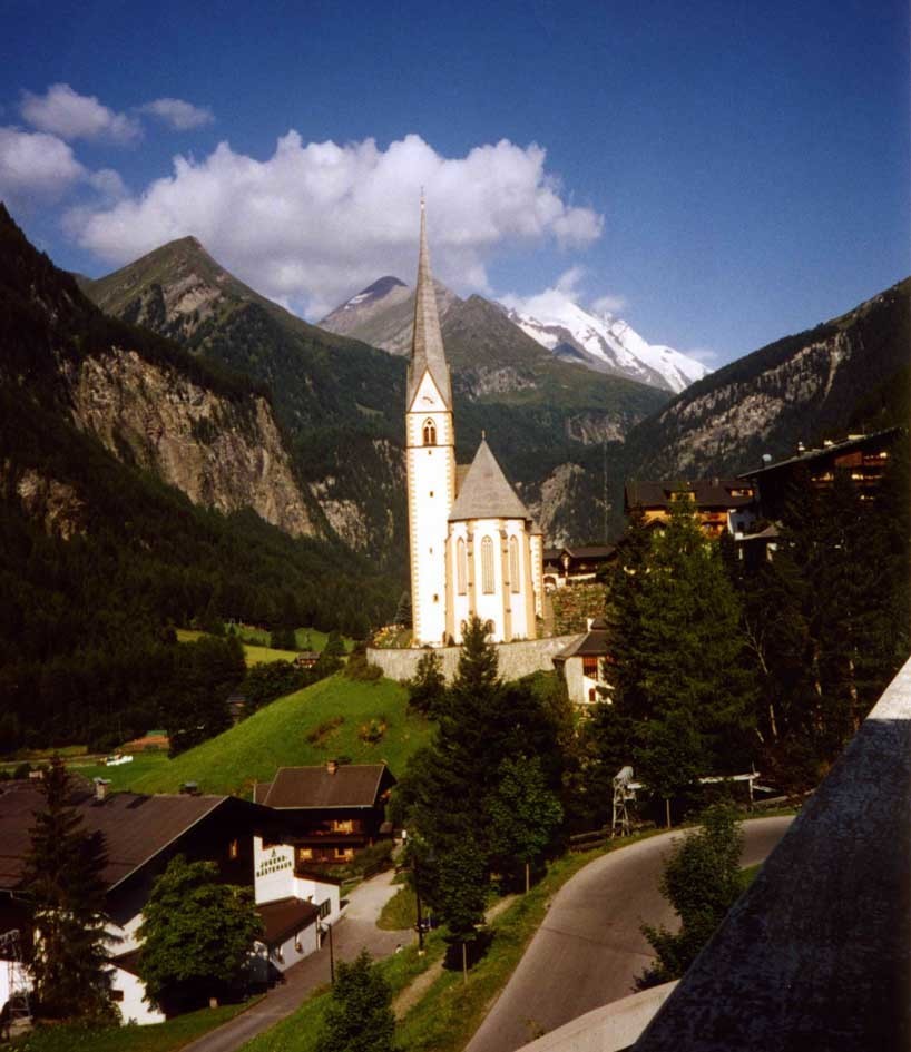 | 8月16日は好天に恵まれた。ハイリゲンブルートからリフトに乗ってシャーレック(2,556m)に登ることにした。乗車駅に行く途中、先ずはハイリゲンブルートの全景を撮影した。(写真2)背景にはグロース・ブロックナーが聳えており、右上の斜面にある見晴らしの良いペンションに数組の宿泊客と共に2泊した。左側に見えるヴィンツェン教会は、東ローマ帝国からキリストの聖血を持って旅の途中で当地で倒れた官吏と聖血のために建堂された。(写真3) | ||