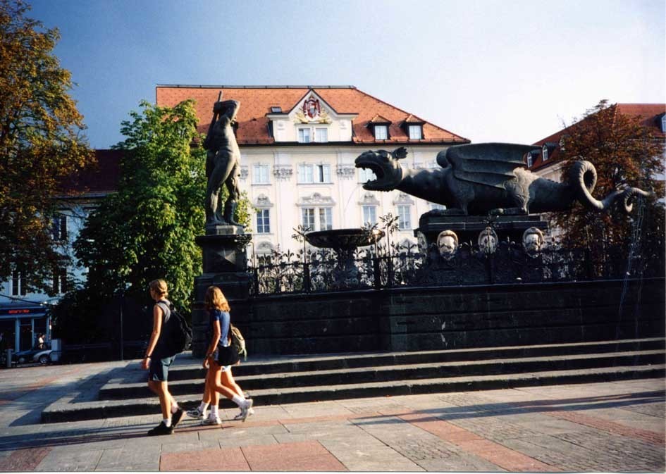 | 8月17日朝、直通バスでリエンツに到着した。当地は南側からグロースグロックナーを訪れる拠点になっており、瀟洒な街並みである。(写真7)ハウプト広場を通り過ぎて、町の西部にあるブルック城を訪れた。(写真8)現在は、東チロル郷土博物館になっている。12時過ぎにリエンツ駅から列車に乗り、2時間少々でクラーゲンフルトに到着した。当地はオーストリア南部の州都であり、交通の要所でもある。2011年6月7日にスロベニア、クロアチアのツアーに参加した時も、ウィーンから当地を経由してスロベニアへ入国した懐かしい町である。駅は町の南端にあり、駅の近くのホテルにリュックを預け、ゆっくり町中を歩き回った。最も有名な龍の噴水(リントヴルム)を(写真9)に示す。アルター広場を中心に、州庁舎、市庁舎、裁判所などがあり、南下すると大聖堂や州立博物館などがある。 | ||