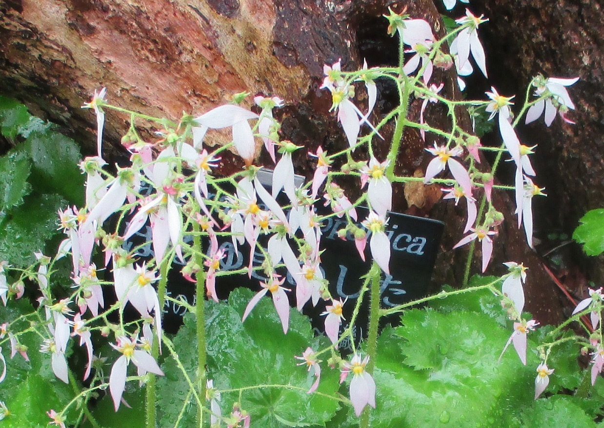 ●はるゆきのした:日本固有種。花弁は5枚で、下の2枚が大きい。属名の Saxifraga はラテン語の「Saxum(石)+frangere(砕く)」からきている。この属のある植物が尿の結石を溶かす作用があると考えられたことから名付けられた。