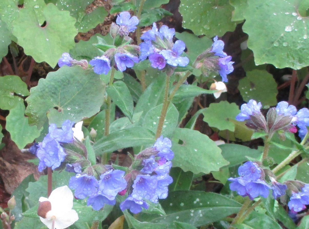 ●プルモナリア:原産地=ヨーロッパ~バルカン半島。花色は(青、紫、ピンク、白)。11/16の誕生花。この写真にも、花弁と葉に水滴が付着しています。