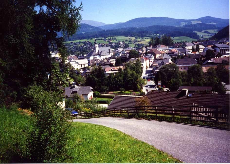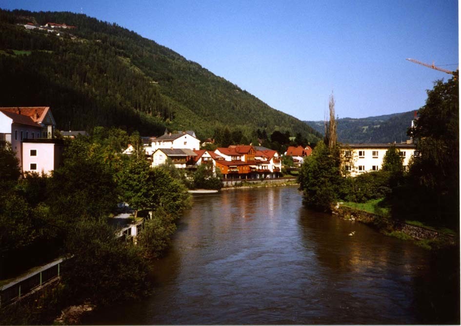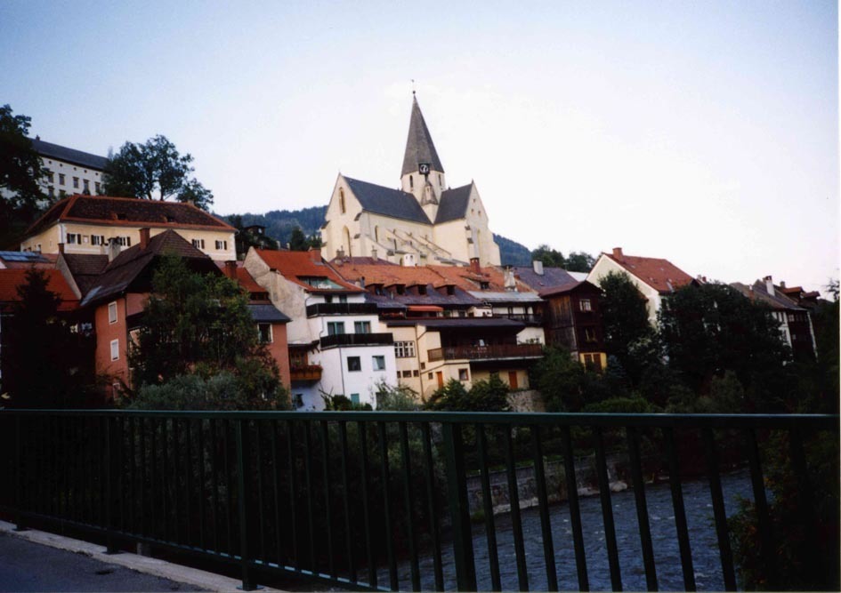 ラウンスドルフ駅を13時30分に出発し1時間10分でウムツーマルクト駅に到着した。(写真4)16時10分に列車を乗り換え16時50分にムーラウ駅に到着した。鉄道はムール川の南に沿って走っており、駅から橋を渡って大急ぎで町の風景を撮影した。(写真5、6)この町の道は敵の攻撃から守るため、くねくねと曲がっているが、景色は趣がある。
