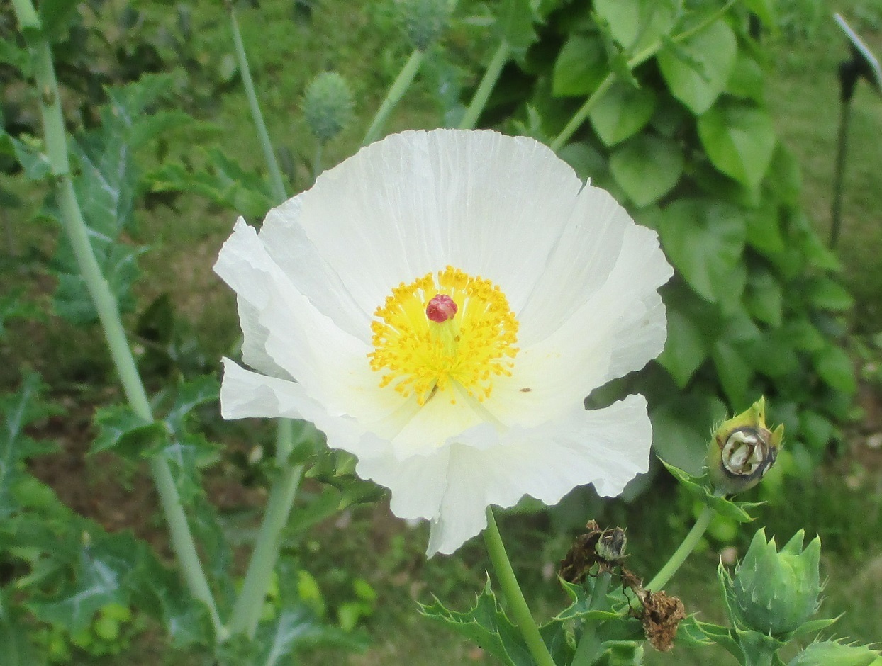 ●シロアザミゲシ:6月6日に小石川植物園で撮影しました。原産地=米国南部。花が芥子に似ていて、葉が、トゲがあって薊(アザミ)に似ているのでこの名前になった。学名は「Argemone hispida」:属名「Argemone」はギリシャ語の「argemon(白内障)」から7きている。汁液がこの病気に効くことから名付けられた。種小名の「hispida」は「剛毛のある」という意味。