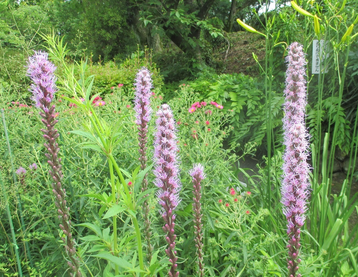 ●リアトリス:6月22日に大船植物園フラワーセンターで撮影しました。別名=「百合薊(ゆりあざみ)」、「麒麟菊(きりんぎく)」。キク科ユリアザミ属の多年草。北アメリカ原産、大正末期に渡来。花色は白やピンクで、花は上の方から咲き下る。