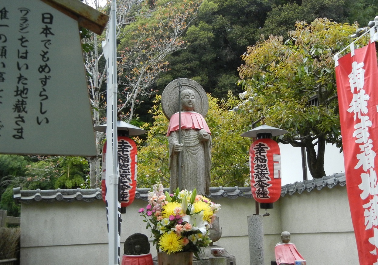 | 山門の脇にお地蔵さんが置かれています。このお地蔵さん大変めずらしい草鞋履き。幸福地蔵という名でひとつお願いをするとどこにでも出かけてその願いをかなえてくださるのだそうです。 | ![]() |