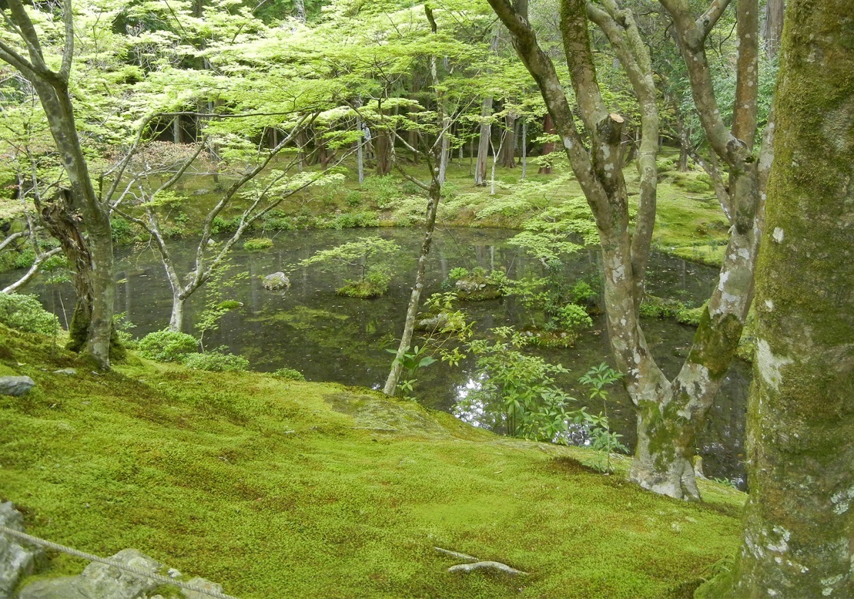 写経の後だからでしょうか。丁度落ち葉を掃いているお坊さんがおられたので「この苔どのような手入れをしているのですか」と尋ねましたら「いやなにもしていません。手入れなんてせんのです。土地が苔にあっているのです」と。前回ここを訪れたときには「この苔にはどんな肥料をやるのですか」と尋ね「肥料、とんでもない、そんなことをしたら苔は枯れてしまいます」と笑われたものでしたが。それにしてもこれだけの広さに美しい苔が生育しているのには秘密があるはず。
