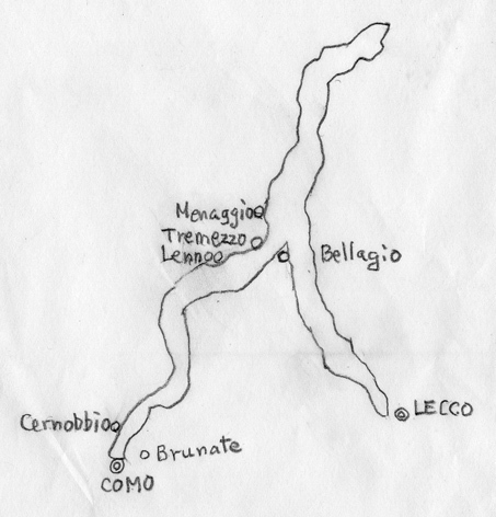 7月31日朝8時25分に列車でミラノを出発し、北上して40分後にコモ駅に到着した。駅から東方に進み、ドゥオーモDuomo)広場の近くにあるホテルにリュックを預けて、コモ(Como)の港に行った。参考までにコモ湖の地図を右に示す。