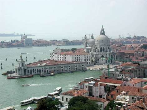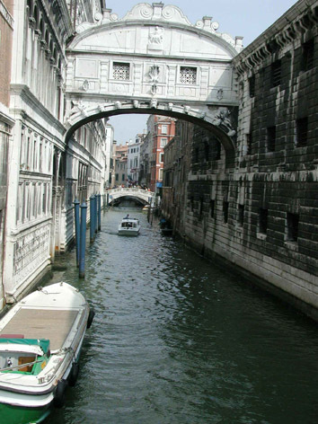 到着前に鐘楼とドゥカーレ宮殿を撮影した。(写真4)先ずは一番高い96.8mの鐘楼にエレベーターで登り、四方のパノラマを撮影した。その中で最も美しいサルーテ教会を掲載することにした。(写真5)次いでサン・マルコ寺院とドゥカーレ宮殿をゆっくりと見学した。ドゥカーレ宮殿の2階と新牢獄が運河を挟んで「溜息の橋」で繋がれている。(写真6)外観は大理石で作られて美しいが、ドゥカーレ宮殿で有罪の判決を受けた人は、この橋からこの世に別れを告げて溜息をついたので、橋の名前になったと言われている。素晴らしい構図なので、多くの画家が「溜息の橋」を描いている。サン・マルコ寺院から近道を通ろうとしたら、運河で行き止まりになり困っていたら、近くの橋を渡って建物の中に消えたのを発見して、真似をしたら建物の中を通り抜けて広い道に出た。頭にきた記念に橋まで戻り一枚写真を撮影したら、帰国後生活感溢れる構図であることを発見して、F50号の油絵に描き「昼下がりの運河」として新構造展に出展した。クラスブログ2008-12-15「昼下がりの運河」に掲載したので、写真と説明は省略する。