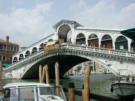 | サン・マルコ広場近傍の探索を終えて、再び船に乗って運河を巡り、数多くの宮殿や教会を撮影して、100枚近く撮影した。最も気に入った「リアルト橋」を(写真7)に示す。ここでは下船して橋を渡り、眼下の商店街まで撮影した。運河の曲がり角に来ると、全て絵画の構図になるような気がした。 | ||