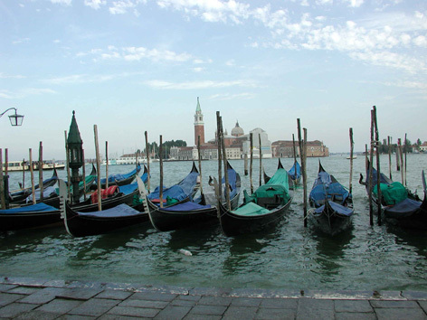 ヴェネチアは何日滞在しても飽きることはないだろう。しかし、旅行日程は限られている。疲れ果てて最後はサン・マルコ寺院の前に戻って来た。(写真8)カッフェの椅子に座り込み、楽団が奏でるロマンチックな音楽を聴きながら、冷たい飲み物で口を潤しながら至福の時を暫し過ごした。小サン・マルコ広場から数隻のゴンドラを撮影したが、背景にはサン・ジョルジョ・マッジョーレ島の教会が見える。(写真9)ここも多くの画家が描いて立派な作品にしている。夕暮れも近づいてきたので、再び船に乗ってローマ広場に帰り、サンタ・ルチア駅から列車に乗ってパドヴァに帰った。