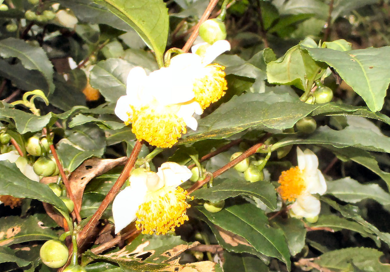 ●チャノキ(茶の木):10月18日に、新宿御苑で撮影しました。(ツバキの仲間)新芽を摘んで「日本茶」にする。