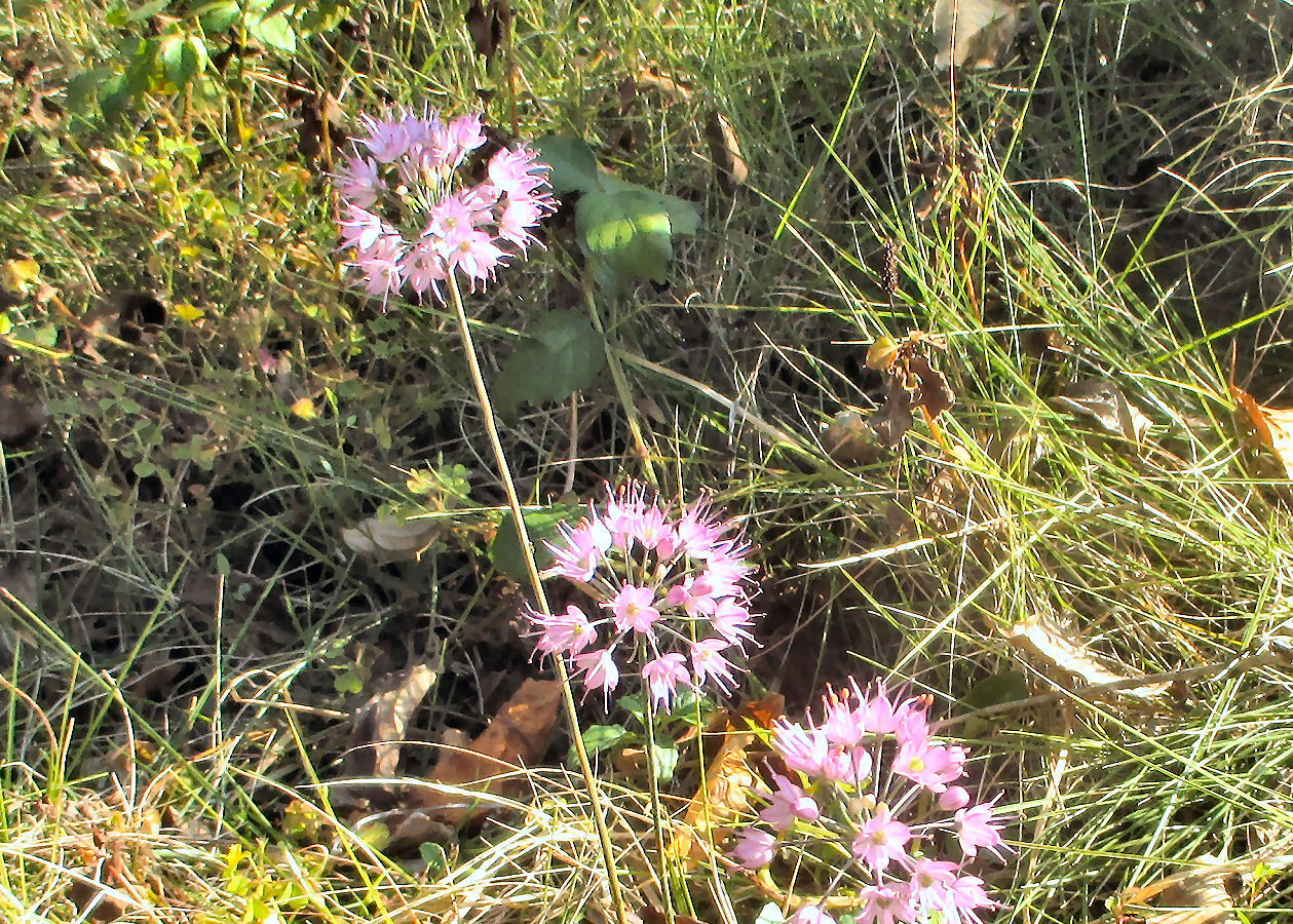 Allium は「ニンニク」の古いラテン名で「匂い」という意味が語源。山に野生するらっきょうの意味。食用にはしない。茎の先端にピンク色の球状の花をたくさんつける。