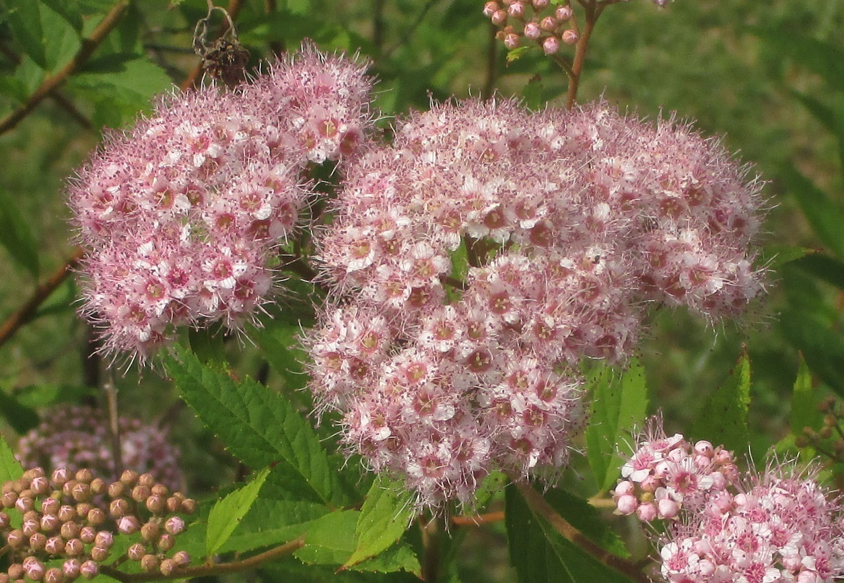 ●シモツケ(下野):バラ科シモツケ属の落葉低木。日本各地(北海道から九州)、朝鮮、中国の山野に自生する。耐寒性が高く、富士山でも見られる。下野国(栃木県)で最初に発見されたことから「下野」と名付けられた。同じシモツケ属の仲間に「コデマリ・ユキヤナギ」がある。