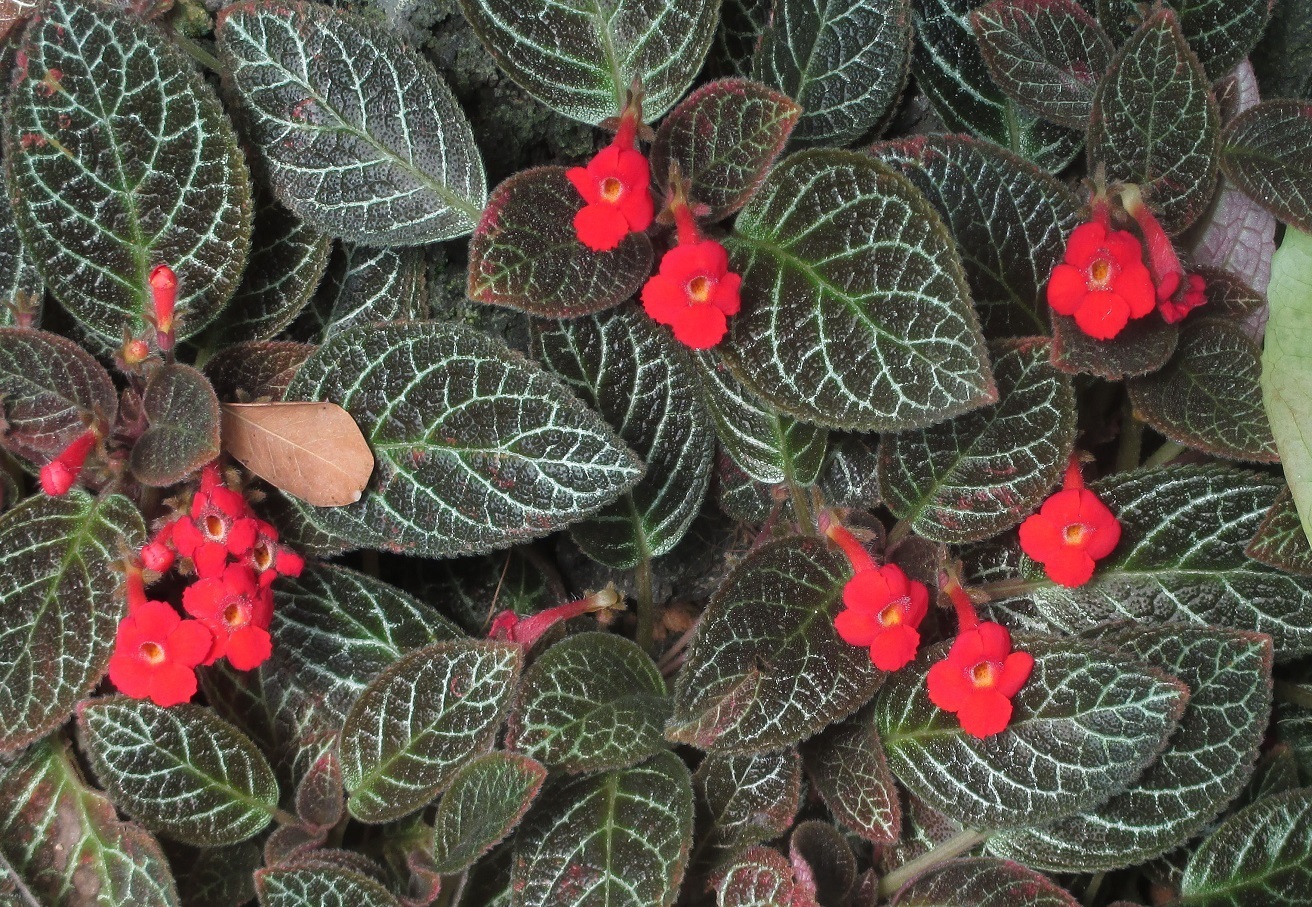 ●ベニハエギリ:(イワタバコ科)の植物。流通名(エピスシア)。中央アメリカ(コロンビア、ベネズエラ)の熱帯林に生育する常緑多年草。別名:ベニギリソウ(紅桐草)。葉の変化を楽しむ植物のようです。厚手の葉に複雑な模様が浮き出ていますね。