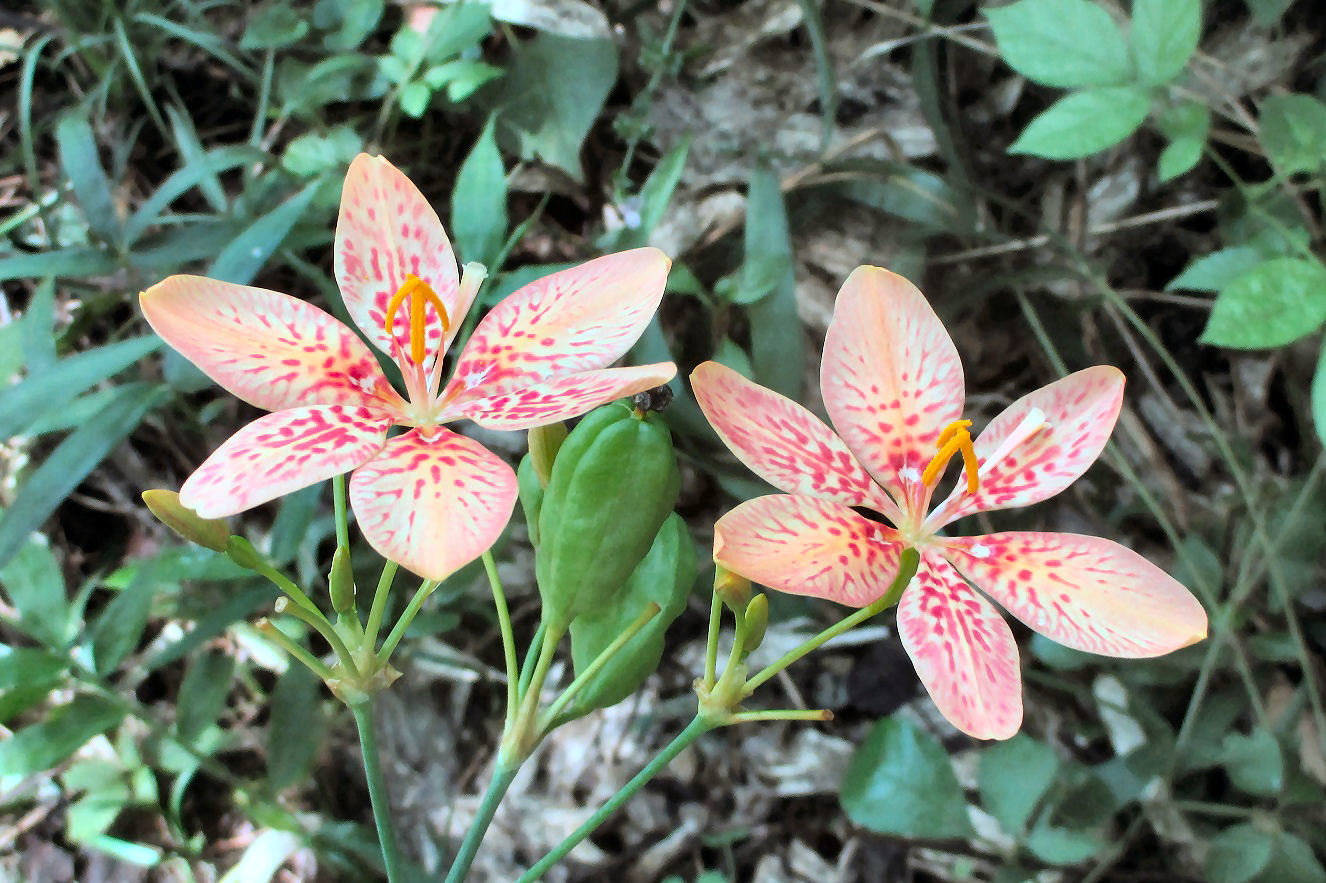 ●ヒオウギ(檜扇):葉が“扇”を広げたような姿。これが「檜扇(ひおうぎ)」の名前の由来。オレンジ色の斑点がある6弁花が咲く。檜扇とは(ヒノキの薄い板をとじ合わせた扇)のこと。種は黒色で「射干玉(ぬばたま)」または「烏羽玉(うばたま)」という。種が黒い(烏は黒い)ことから別名「烏扇(からす)おうぎ」ともいう。