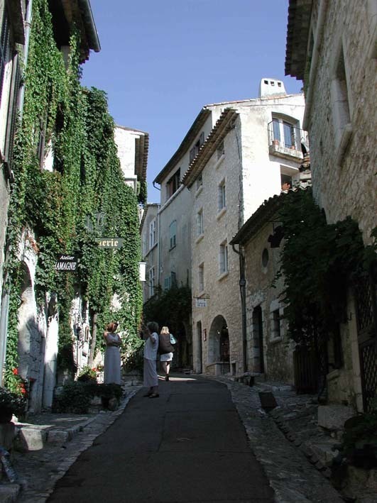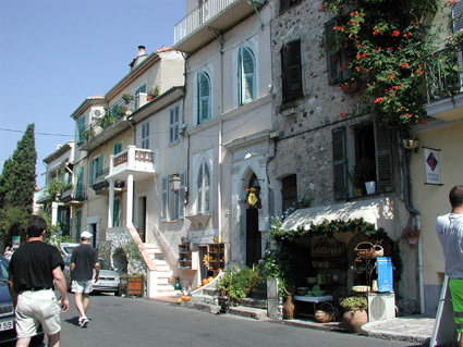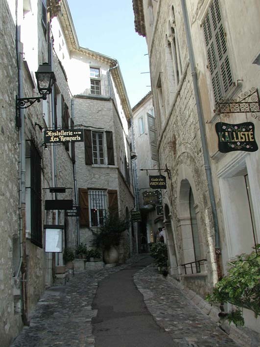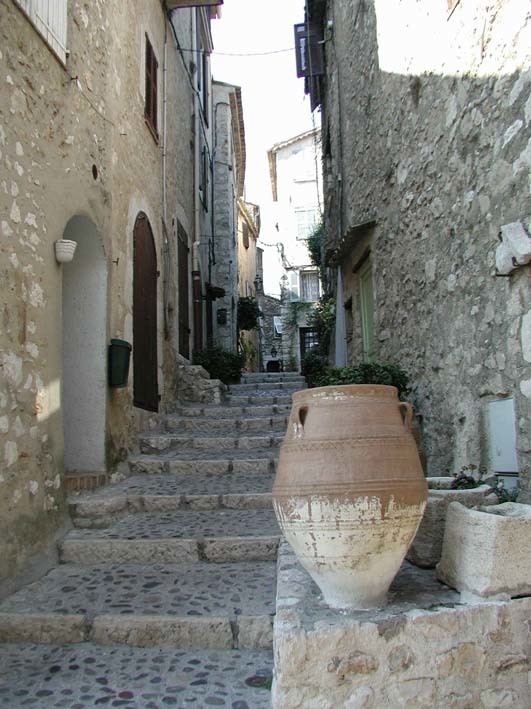 丘の上にある鷲の巣村で、(写真1)(写真2)(写真3)のような石畳の坂道を登って行くと、両側から古い建物が迫って来る。町の中心にはサン・ポール教会(Eglise St-Paul)がある。