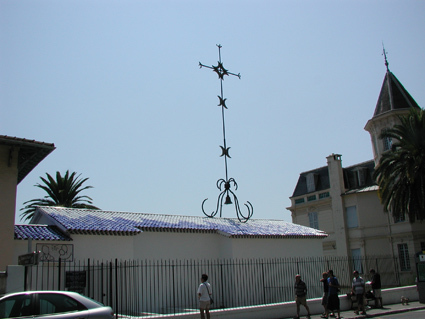 再びバス停に戻ってバスに乗り、北西に進んでヴァンス(Vence)のバス停に到着した。バス停は、ヴァンス市街の南西の端にあるが、ここから少し北西に歩き、五差路を右に曲がって行くと、リュビアン川(Lubiane)の橋がある。ここから南東を眺めると、サン・ポールの全景が現れ、急いで撮影した。(写真4)更に直進するとロザリオ礼拝堂(Chapelle du Rosaire)が左側に現れた。(写真5)ヴァンス市街からは、15分位である。ロザリオ礼拝堂は、マチスが晩年に4年間をかけて制作したそうだ。ゆっくりと内部を見学し、庭からヴァンスの市街を展望した。すっかり満足してヴァンス市街に戻り、大聖堂、市庁舎、ヴィルヌーヴ城を眺めながらバス停に戻った。