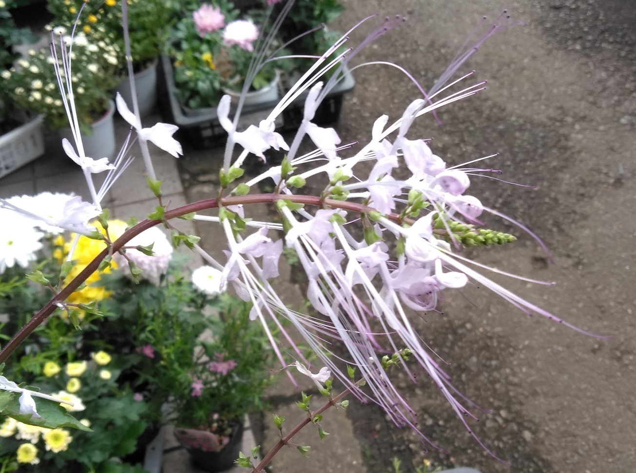 ●ネコノヒゲ(猫の髭):10月14日に、宮前区内を散歩の途中に花屋の店先で撮影しました。しそ(紫蘇)科の花。インド、マレーシア地方原産。メシベより長く突き出ているオシベが猫の髭のように見えることからこの名前に。別名=「キャッツウィスカー・クミスクチン」