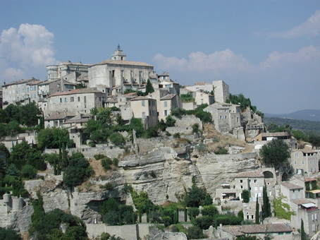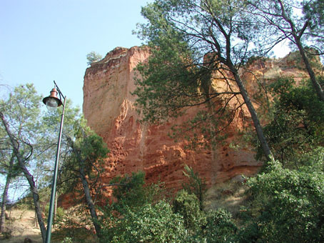 次に北東に進みゴルド(Gordes)を訪れた。(写真8)丘の上の古城を中心に石造りの家並が見事に階段状に配置され、リュベロン地方で最も美しい景観であると言われている。多くの画家がこの景観を描いている。更に、東方に進みルシヨン(Rousillon)を訪れた。(写真9)は「巨人の道」(Chaussee des Geant)と呼ばれる遊歩道の入り口である。ルシヨンは顔料の原料になるオークルの丘に造られた村で、赤色の強い黄土の色合いが様々な色彩を現し、不思議な雰囲気を醸し出している。ここから見下ろす風景も素晴らしい。幸運にも村で結婚式が行われており、特別に新郎新婦の写真も撮影させてもらったが、掲載することは出来ないので残念である。参加者全員後ろ髪を引かれる思いで帰路につきアヴィニョンには19時に到着した。