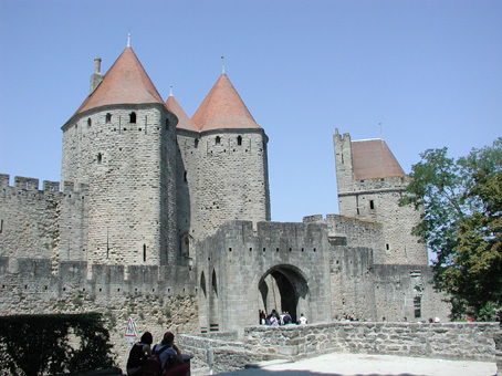 | ここで下車して駅の写真を撮影し、乗換えて12時3分に出発して西方に進み、12時34分にカルカッソンヌ駅(Carcassonnne)に到着した。駅の近くで昼食をとり、南進して左折してオード川(Aude)にかかる旧橋(Pont Vieux)を渡って20分歩いて城のカルカッソンヌ門に到着した。(写真1)全長3km、52の塔がある城壁を見学したら、へとへとになった。(写真2) | ![]() |