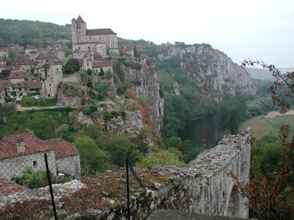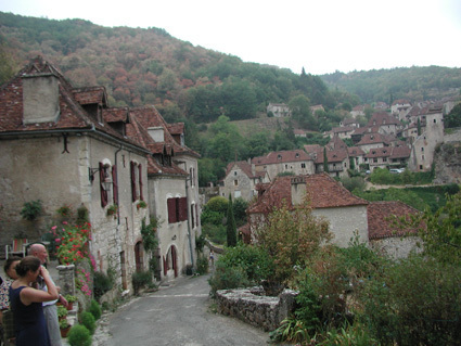 8月14日は、フィジャックのバス停から8時17分にカオール(Cahors)行きのバスに乗り、西進してTour de Faureのバス停に9時42分に到着し、途中下車した。近くを流れるロット川の橋を渡り、坂道を30分登って、サン・シルク・ラポピー(St-Cirq Lapopie)を訪れた。(写真4)(写真5)の様な古い家並みを通り抜けて行くと、丘の頂上にサン・シルク教会(Eglise St-Cirq)がある。(写真6)はサン・シルク・ラポピーの全景である。丘を降りて、Tour de Faure のバス停で帰りのバスを待っていたら、昨日、フィジャックで知り合った若い日本人女性がカオール行きのバスの窓から手を振っていたので、我々も手を振って応答した。我々は再びバスでフィジャックに帰着した。