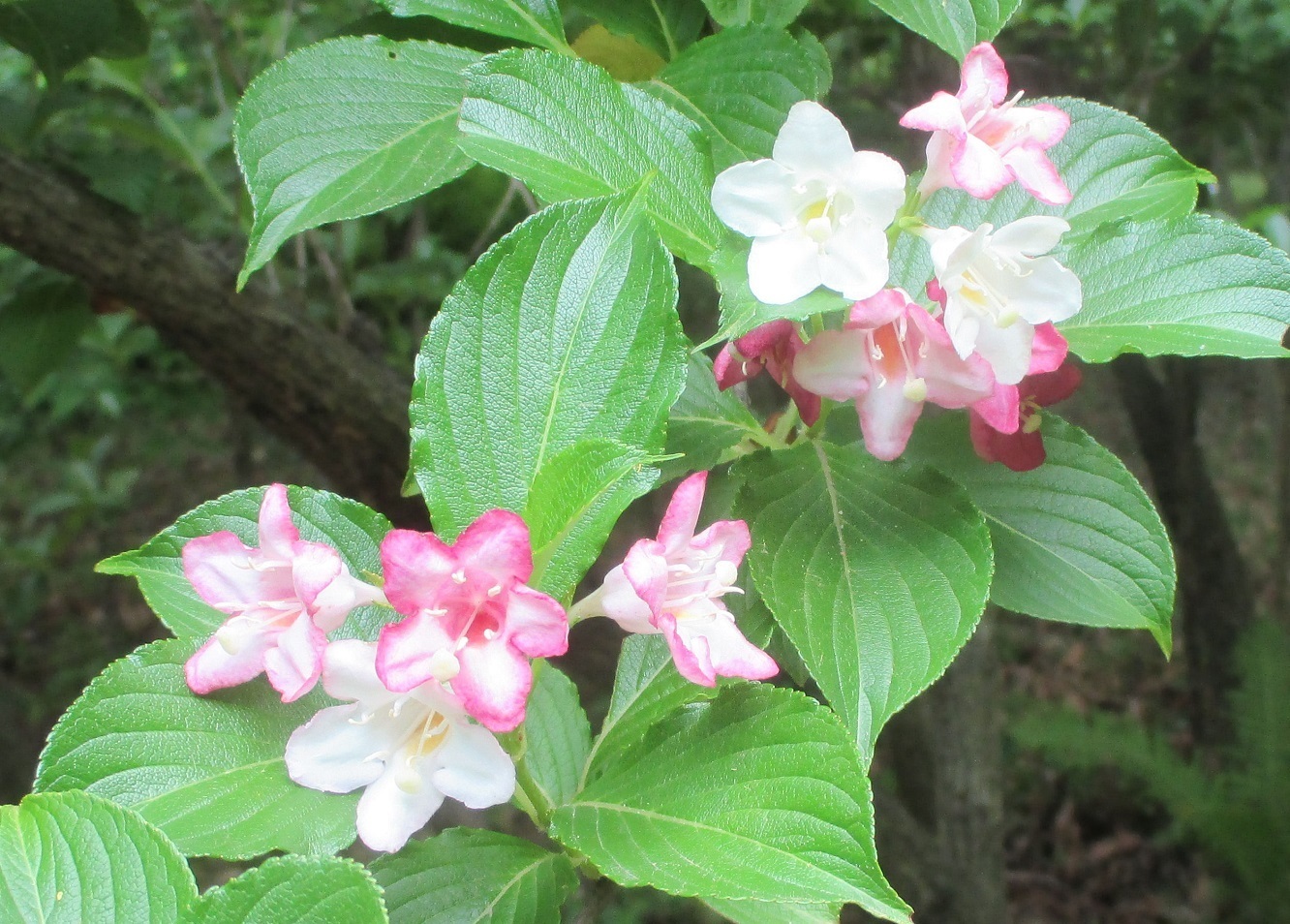 ●ハコネウツギ(箱根空木):5月16日に、新宿御苑で撮影しました。スイカズラ科。別名(ゲンペイウツギ)。花色は白→ピンク→赤色になっていく。海岸近くに生える。箱根近辺で自生する。