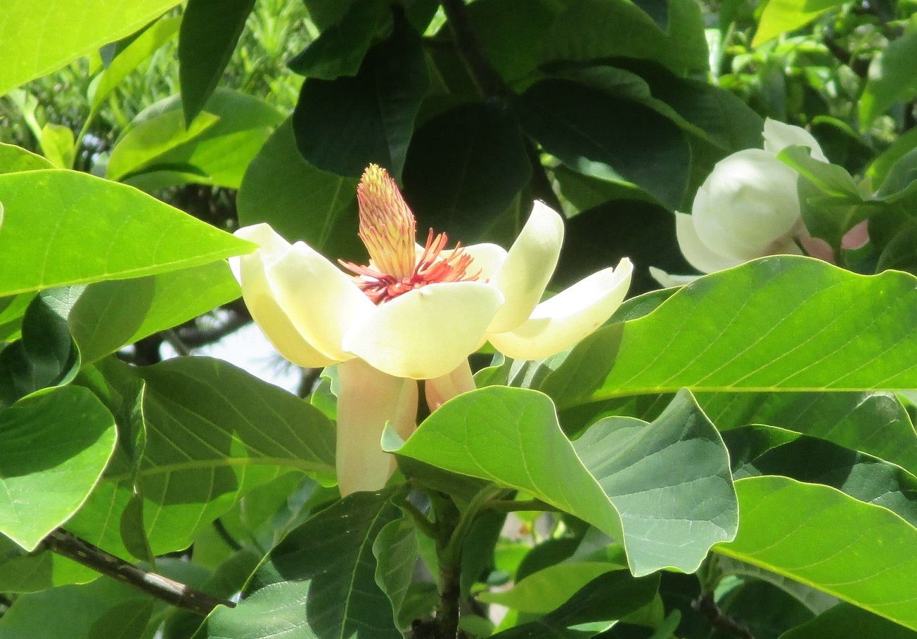 ●ウケザキオオヤマレンゲ(受咲大山蓮華):5月15日に大船植物園フラワーセンターの和風庭園で撮影しました。モクレン科。オオヤマレンゲ(大山蓮華)とホオノキ(朴の木)の自然交雑種と考えられています。花は上向きに咲きます。