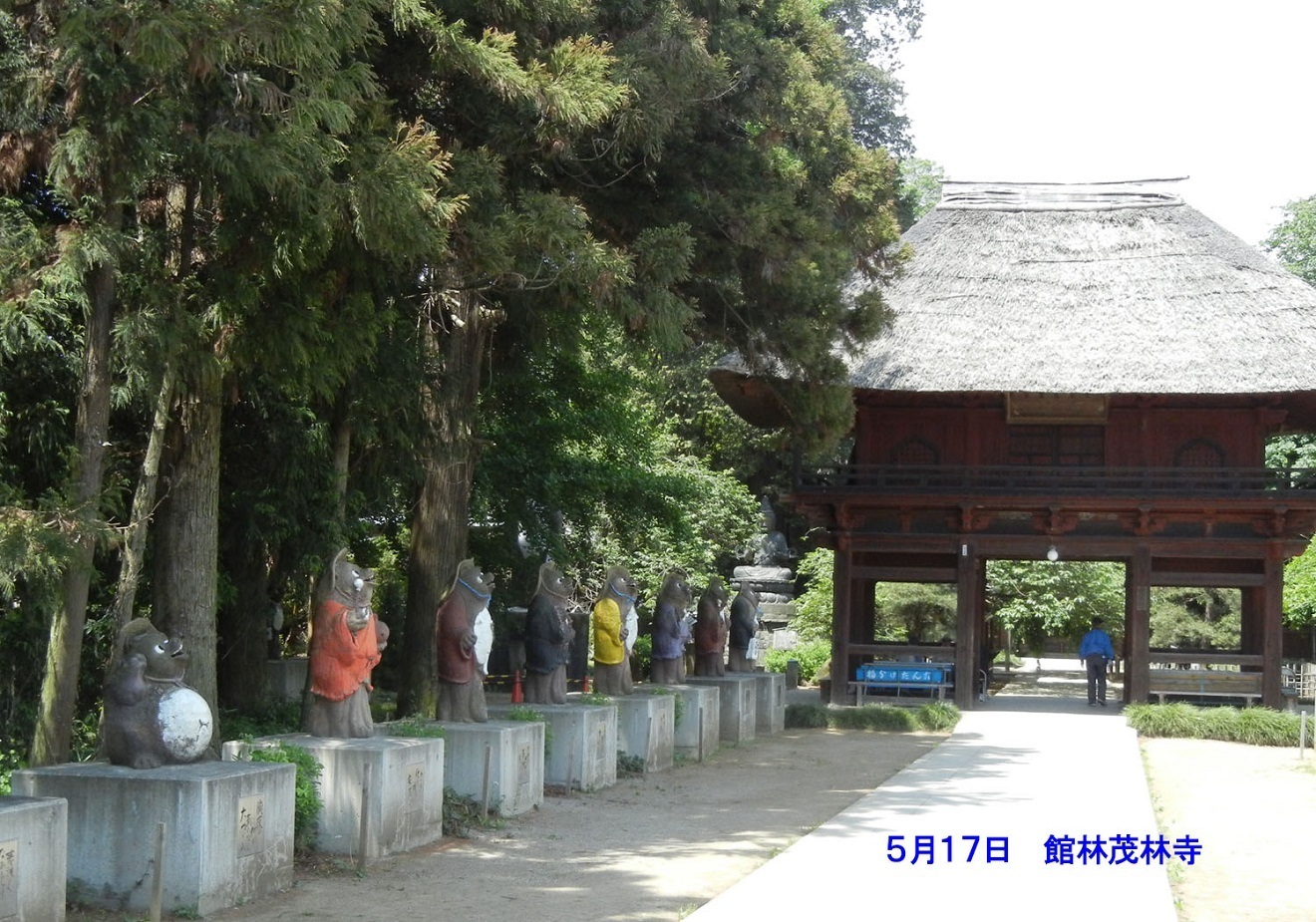 これが評判になって道具屋さんは沢山の木戸銭を儲けたという恩返しのお話し。現在の茂林寺には茶釜が飾ってありますし、三門の前にはずらりとタヌキの像がならんでお参りの人を楽しませてくれています。そして茶店の店先にも。