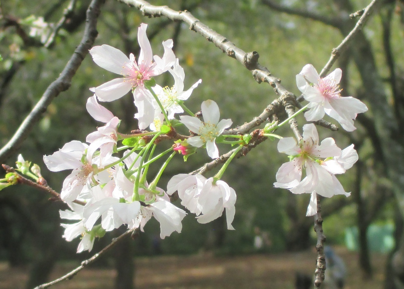 ●十月桜(?):10月10日に新宿御苑で撮影しました。新宿御苑の説明地図で(ジュウガツザクラ)と明記してあるところで撮影したのに、写真をよく見ると花が一重にも見れるので、(?)を付けました。正しくは十月桜は八重で、冬桜が一重です。