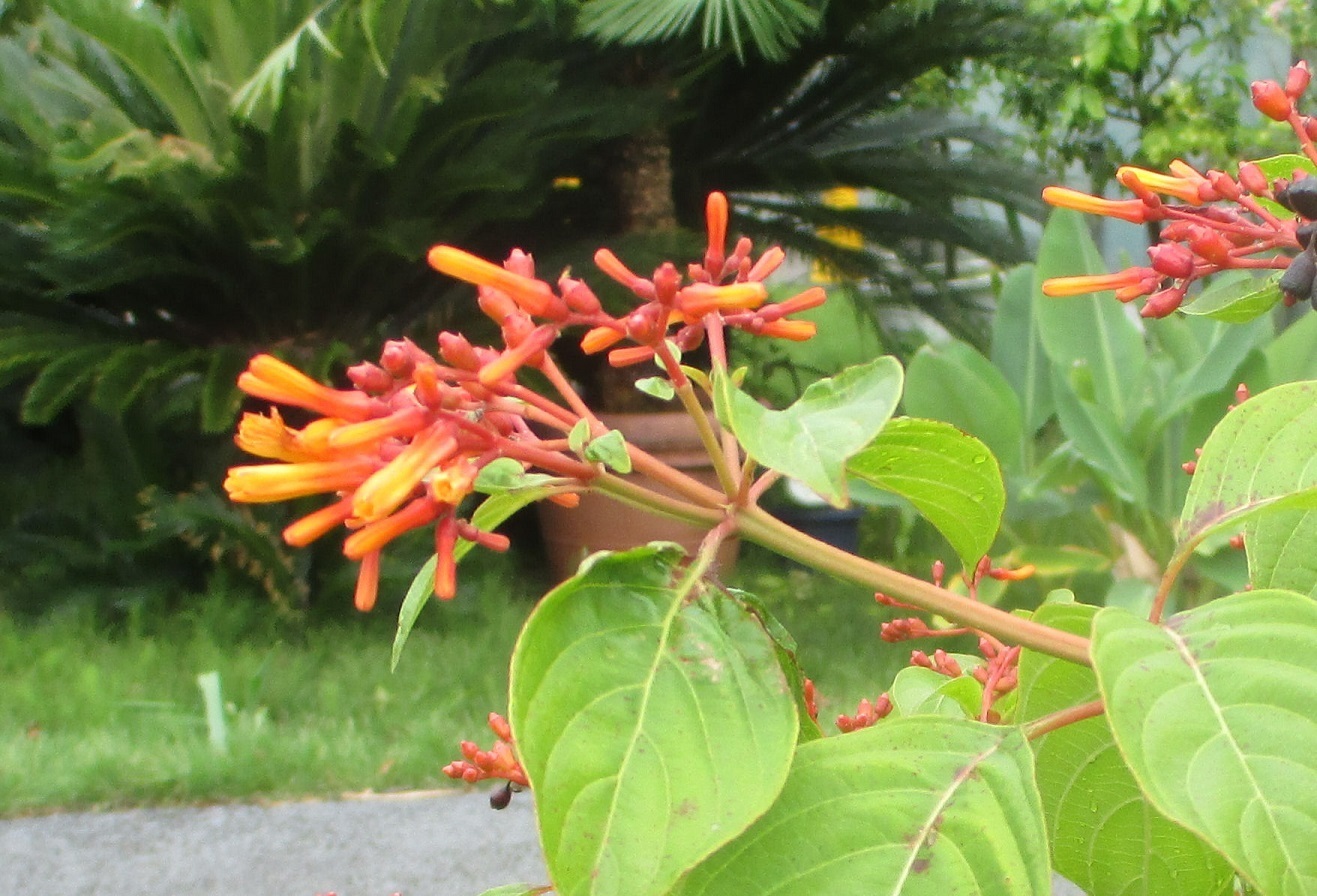 ●ハメリア:10月10日に新宿御苑の温室の入口付近で撮影しました。中南米(中央アメリカ~ブラジル)原産。一年を通じて枝先に黄~朱色の花を次々に咲かせる。花期は通年だそうです。