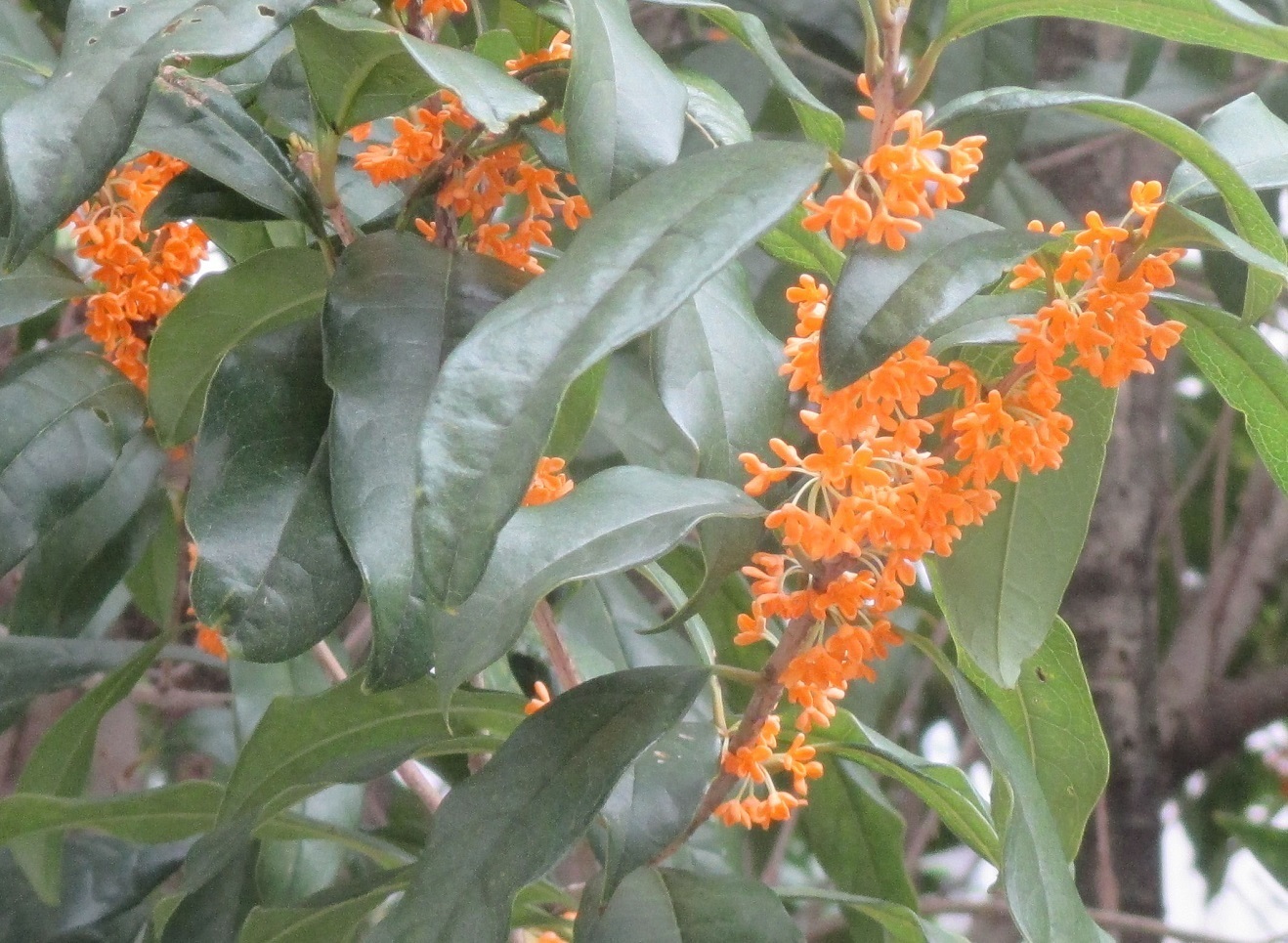 ●金木犀:10月16日に我が家の近くで撮影しました。中国南部原産。江戸時代に日本に渡来。雌雄異株だが輸入された時に雄株しか入ってこなかったことから、日本にあるキンモクセイには実(種)が付かないそうです。