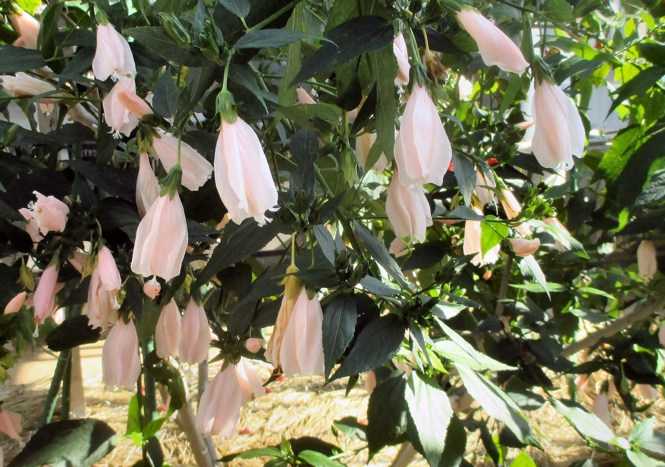 ●ウナズキヒメフヨウ:大船植物園フラワーセンターの温室内で撮影しました。本ブログの(2014/3/1)号で、新宿御苑の温室のものを紹介していますが、花色が赤でした。今回の花色は薄ピンクです。花が蕾の時は上向きだが、だんだん下向きになることから、ウナヅキ(頷き)の名前が付いた。熱帯アメリカ原産で、日本では九州南部~沖縄に分布。