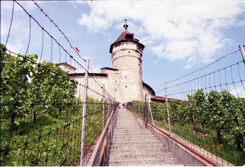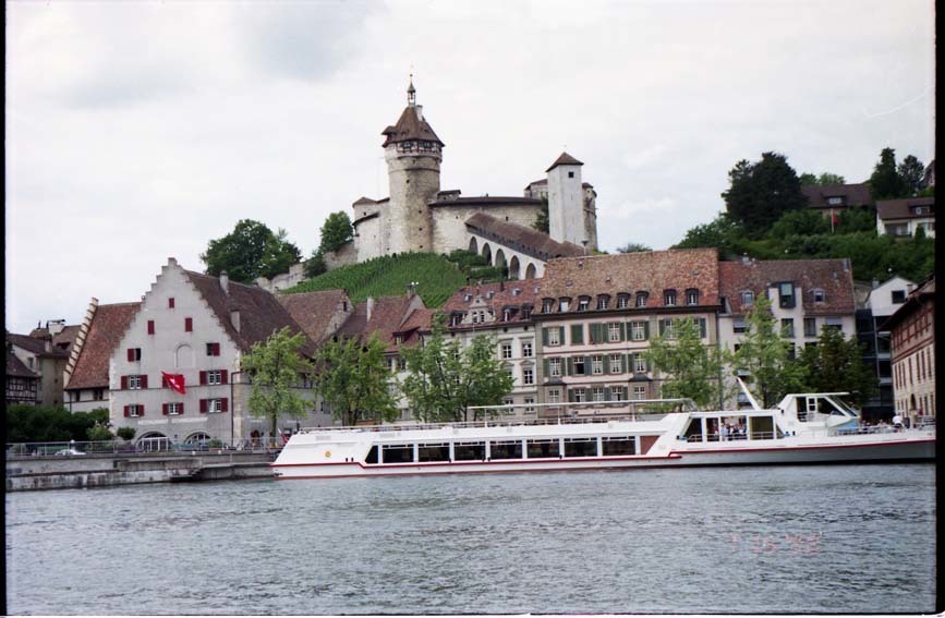 騎士の家から更に東に進み丘の上に あるムノート城(Schloss Munot)を訪れた。(写真4)葡萄畑の丘にある城からは美しい旧市街(写真5)が見える。左方に聳える時計がある塔は、聖ヨハン教会(St.Johann Kirche)で、宿泊ホテルはその近くにある。城から90度方角を変えて見下ろすと、ライン川(写真6)が見える。城には薔薇の庭園があり、囲みの中の草園には鹿が飼育されていた。ライン川の橋を渡ると、城の全景が現れる。(写真7)川岸には、ライン下りの観光船が停泊していた。地図を良く眺めるとライン川はここからスイス領を西に進み、バーゼルからフランスとドイツの国境を北上し、それからドイツ領を北上している。7月8日に訪れたドナウエッシンゲンに「ドナウの泉」があったが、シャフハウゼンからはそれ程遠くないので驚いた。