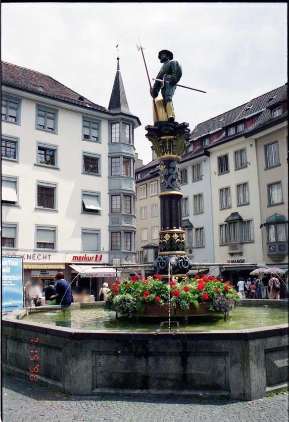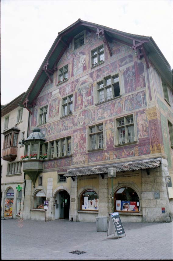 スイス領だが、ドイツとの国境に近いシャフハウゼンを訪れたのは、ジュネーブに11年間駐在した新井兄の推奨があったからである。駅から東へ進むと広場に銅像が現れた。(写真1)更に進むと(写真2)の様な家並が現れホテルに到着した。リュックを預けて身軽になり、ホテルの近くにある騎士の家(Haus zum Ritter)を撮影した。(写真3)壁一面にフラスコ画が描かれており、左側には、旧市街の建物に典型的な出窓がある。シャフハウゼンがドイツ風中世都市である面目躍如と言える。騎士の家から南に進むとライン川の近くにIWCシャフハウゼン博物館(IWC Schaffhausen Museum)があるが、今回は割愛した。この博物館では、シャフハウゼンが高級時計の製作で繁栄した工業都市としての一面を知ることができる。