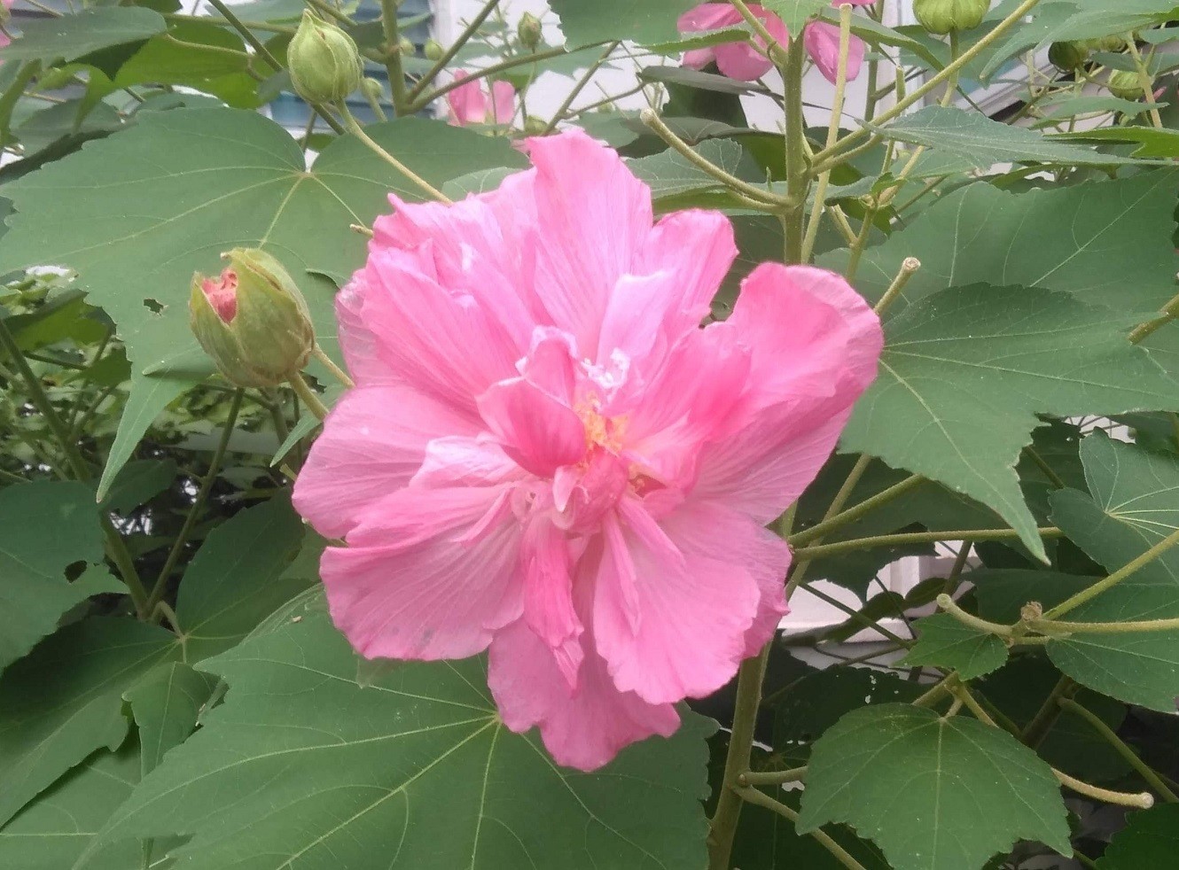 ●酔芙蓉(すいふよう):我が団地内にて8月27日の13時22分に撮影しました。原産地は中国、日本。朝方は白色→徐々にピンク色→夕方には萎んでしまう。2010年には、13時53分撮影の写真を載せましたが、今回の方が良く撮れています。